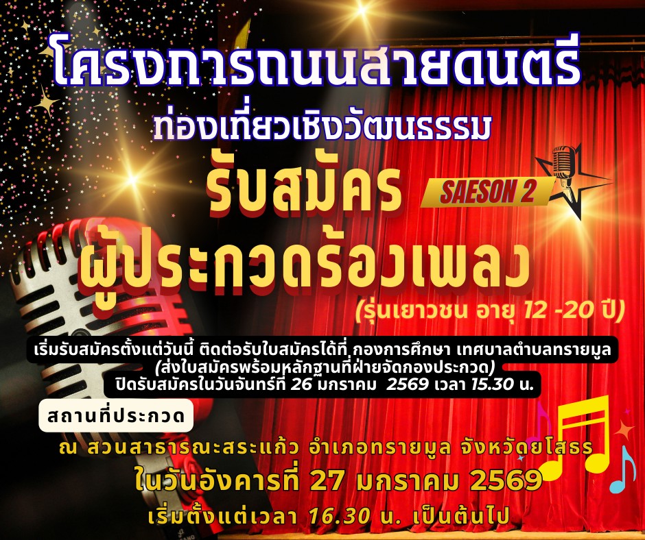 หัวข้อ :: โครงการถนนสายดนตรี (ท่องเที่ยวเชิงวัฒนธรรม) เทศบาลตำบลทรายมูล เปิดรับสมัครผู้ประกวดร้องเพลง (รุ่นเยาวชน อายุ 12 - 20 ปี)